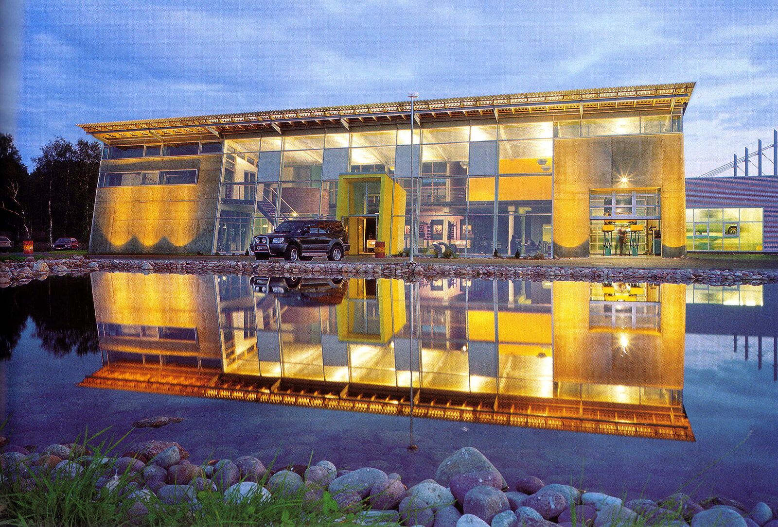 Neubau eines Autohauses in Riga (Lettland) mit Ausstellungshalle und Werkstätten in Stahlbauweise mit schiefwinkligen Außenwänden.